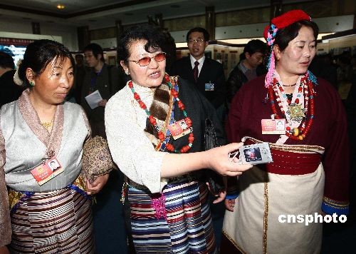 3月8日,參加全國人大會(huì)議的西藏團(tuán)藏族女代表參觀在北京民族宮舉辦的西藏民主改革50年大型展覽。中新社發(fā) 杜洋 攝