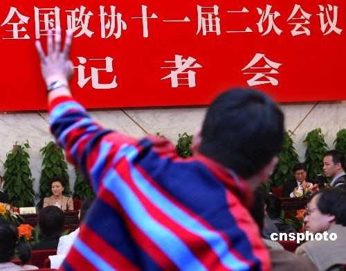 全國政協(xié)十一屆二次會議3月8日就2010年5月上海舉辦世界博覽會舉行記者會,香港大公報記者踴躍提問。萬季飛、周漢民、成岳沖、楊瀾等四位全國政協(xié)委員回答了籌備中的上海世界博覽會資金來源,籌備進度情況,外界關(guān)注的美國、臺灣參展情況,金融危機的影響及民營企業(yè)參展情況等問題。與會中外記者表現(xiàn)出極大關(guān)注,爭相提問。中新社發(fā) 宋吉河 攝