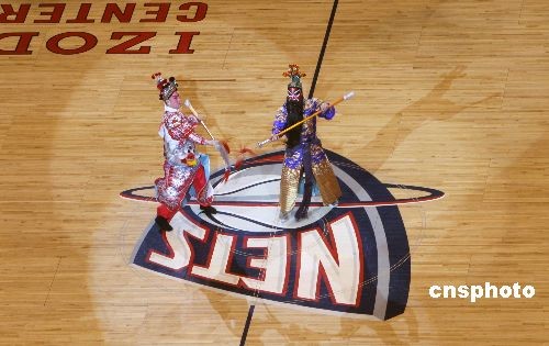 當(dāng)?shù)貢r(shí)間3月8日晚,美國(guó)大紐約地區(qū)“2009中華之夜”晚會(huì)在NBA新澤西網(wǎng)隊(duì)主場(chǎng)舉行,NBA賽場(chǎng)吹出一陣“中國(guó)風(fēng)”。在新澤西籃網(wǎng)對(duì)陣紐約尼克斯的賽間休息時(shí),傳統(tǒng)京劇表演令許多美國(guó)球迷倍感新奇。中新社發(fā) 魏晞 攝