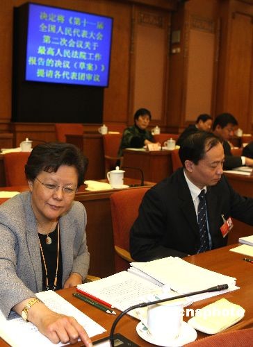 3月12日上午,十一屆全國人大二次會議第三次主席團會議在北京人民大會堂舉行。會議經(jīng)過表決,決定將關(guān)于全國人大常委會工作報告的決議草案、關(guān)于最高人民法院工作報告的決議草案、關(guān)于最高人民檢察院工作報告的決議草案提請各代表團審議。圖為主席團成員范徐麗泰按表決器。中新社發(fā) 任晨鳴 攝