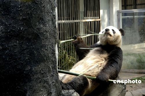 三月十二日,去年從四川地震災區(qū)轉(zhuǎn)移到福州的大熊貓在福州熊貓世界里,躺在明媚陽光下,悠閑地吃著竹子。中新社發(fā) 王東明 攝