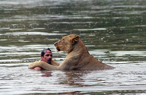 母獅瑪格麗塔將前爪搭在理查德森的肩膀上