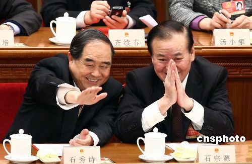 3月13日,十一屆全國(guó)人大第二次會(huì)議在人民大會(huì)堂舉行閉幕會(huì),全國(guó)人大財(cái)政經(jīng)濟(jì)委員會(huì)主任委員石秀詩(shī)、貴州省委書(shū)記石宗源在主席臺(tái)上和主席臺(tái)下的代表打招呼。中新社發(fā) 杜洋 攝