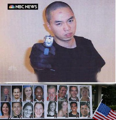 這張美國(guó)全國(guó)廣播公司2007年4月18日晚間新聞的電視截圖顯示,弗吉尼亞理工大學(xué)槍擊案兇手、韓國(guó)籍學(xué)生趙承熙擺出持槍射擊的姿勢(shì)。趙承熙16日在作案間隙曾向美國(guó)全國(guó)廣播公司寄過一個(gè)包裹,里面包括錄像帶和照片,錄像中有不少攻擊和謾罵“富人”的內(nèi)容。趙承熙在弗吉尼亞州一所大學(xué)兩個(gè)多小時(shí)內(nèi)兩度開槍行兇,造成33人死亡,20多人受傷,兇案震驚全球。