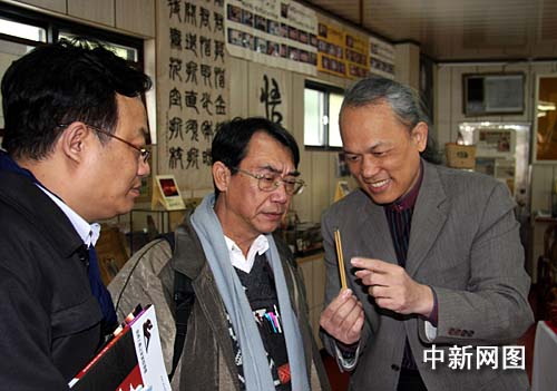 3月14日,由臺(tái)北縣政府文化局委托的專家組在“臺(tái)北縣博物館家族”之一的陳逢顯毫芒雕刻博物館內(nèi)調(diào)研。圖為臺(tái)灣著名微雕家陳逢顯(右一)向?qū)<医M成員展示微雕創(chuàng)作用的特殊工具。作者:陳立宇