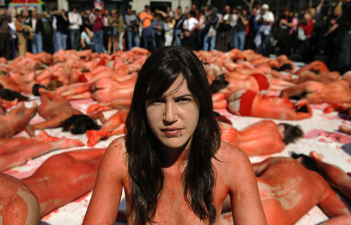 3月15日,西班牙馬德里,動(dòng)物保護(hù)協(xié)會(huì)成員身涂人造血,抗議捕獵海豹。