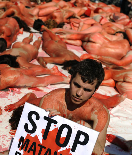 3月15日,西班牙馬德里,動物保護(hù)協(xié)會成員身涂人造血,抗議捕獵海豹。