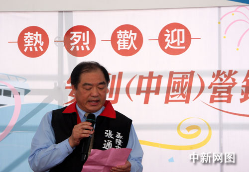 圖為基隆市市長(zhǎng)張通榮在歡迎儀式上致辭。