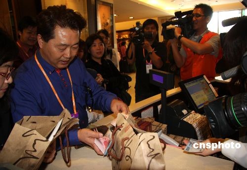 圖為“安利心印寶島萬(wàn)人行”首發(fā)人員在臺(tái)北故宮博物院購(gòu)物。中新社發(fā) 陳立宇 攝