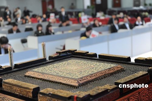 3月18日,2008北京第29屆奧運(yùn)會(huì)開(kāi)幕式演出道具“缶”最后一場(chǎng)專(zhuān)場(chǎng)拍賣(mài)在北京產(chǎn)權(quán)交易所完美落槌。22個(gè)標(biāo)的共320個(gè)缶以總價(jià)4138萬(wàn)元拍出。此外10個(gè)標(biāo)的共200幅竹簡(jiǎn)以總價(jià)637.5萬(wàn)元成交。共有132家單位和個(gè)人參與了此次競(jìng)買(mǎi),單個(gè)“奧運(yùn)缶”的成交均價(jià)12.93萬(wàn)元,超過(guò)第一批“奧運(yùn)缶”成交均價(jià)一倍有余,單個(gè)“竹簡(jiǎn)”成交均價(jià)3.18萬(wàn)元。中新社發(fā) 遠(yuǎn)舟 攝
