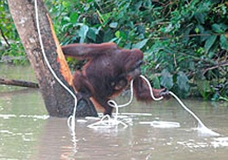 馬來西亞婆羅洲島東北端的一條河流不久前發(fā)生了洪水,一只紅毛猩猩媽媽和她的幼子被困在樹上進(jìn)退兩難,它們已被困在那里好幾天了。世界自然基金會派遣一個救援小組前往該地區(qū),搭建了一個索橋,使他們能夠靠近這對饑餓的猩猩母子。救援人員想出了一個妙招,他們將一根繩子扔給猩猩媽媽,希望她能抓牢這根繩子游到最近的岸上。但是救援人員十分擔(dān)心,猩猩媽媽會因為怕水拒絕抓住繩子游到岸邊。出人意料的是,母猩猩從樹上爬下來,背著孩子毫不猶豫地跳進(jìn)洶涌的洪水中,她手里抓著繩子,并確保猩猩幼子的頭部露在水面上,奮力游向河岸,終于安全到達(dá)岸上。