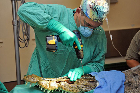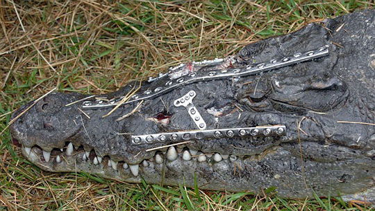據(jù)英國(guó)媒體3月18日?qǐng)?bào)道,美國(guó)佛羅里達(dá)動(dòng)物園一只受傷的大鱷魚,經(jīng)過(guò)手術(shù),頭部被41枚釘子以及4塊鐵板固定,現(xiàn)在被人戲稱為“機(jī)器鱷魚”。這只長(zhǎng)達(dá)10英尺的鱷魚是在一起車禍?zhǔn)鹿手惺軅摹=?jīng)醫(yī)生介紹,現(xiàn)在鱷魚的恢復(fù)情況良好。