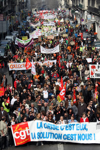 3月19日法國各大工會在全國各地聯(lián)合組織罷工和示威游行等活動,抗議政府在應(yīng)對當(dāng)前經(jīng)濟(jì)危機(jī)過程中忽視勞動者權(quán)益和社會福利。