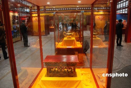為期五天的“雪域風(fēng)情——藏族非物質(zhì)文化遺產(chǎn)精粹展”三月二十日下午在澳門綜藝館開幕,展出了十世班禪獻(xiàn)給中央人民政府的木桌(圖中)等珍貴文物。圖為開幕前工作人員在作最后準(zhǔn)備。中新社發(fā) 畢永光 攝