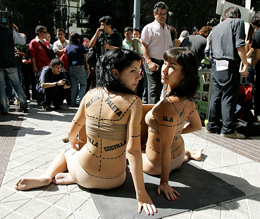當?shù)貢r間3月19日,來自AnimaNaturalis動物保護組織的智利美女在首都圣地亞哥舉辦了一場別出心裁的“裸身切割”活動,呼吁民眾保護動物。