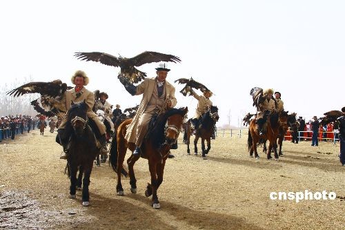 3月20日,新疆阿合奇縣舉辦第二屆獵鷹節(jié),當(dāng)?shù)乜聽柨俗巫迕癖娋奂谠摽h賽馬場(chǎng),展示自家馴養(yǎng)的獵鷹。新疆阿合奇縣的柯爾克孜族人馴養(yǎng)獵鷹有著悠久的歷史,至今,當(dāng)?shù)啬撩袢酝暾A糁嫉鸟Z養(yǎng)方式,被譽(yù)為中國(guó)“獵鷹之鄉(xiāng)”?聽柨俗巫迦嗽诜拍恋耐瑫r(shí),經(jīng)常騎馬到高達(dá)近百米的高山頂上,將自己馴養(yǎng)的獵鷹放飛,因此當(dāng)?shù)乜聽柨俗巫逡脖蛔u(yù)為“鷹王”。 中新社發(fā) 馬衛(wèi)平 攝