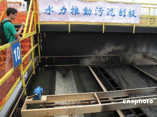 香港特區(qū)政府渠務(wù)署在迎來(lái)成立二十周年之際,于二零零九年三月二十一日向市民開(kāi)放昂船洲污水處理廠,展示污水凈化處理過(guò)程,介紹和體驗(yàn)港府正斥巨資推行的凈化海港計(jì)劃。圖為市民觀看污水進(jìn)入沉淀池后,水力推動(dòng)的污泥刮板在水面上層刮起一層層黑臭污垢的過(guò)程。 中新社發(fā) 余瑞冬 攝