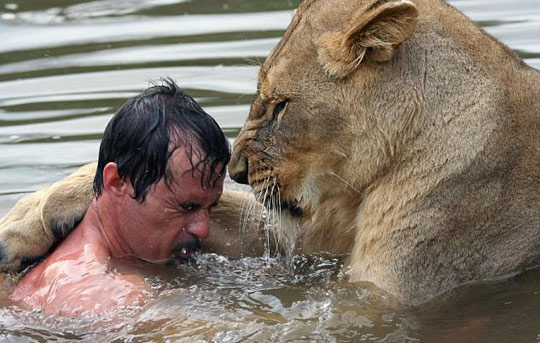 南非動物學(xué)家與獅共泳,F(xiàn)年34歲的動物學(xué)家凱文經(jīng)常采用不同尋常的方法(一起玩、一起睡覺、一起游泳等等)來和常人畏懼的動物進(jìn)行交流,同時和動物們建立了很好的個人感情。和他一起游泳的獅子Meg ,體重185公斤,是個愛好游泳的獅子。