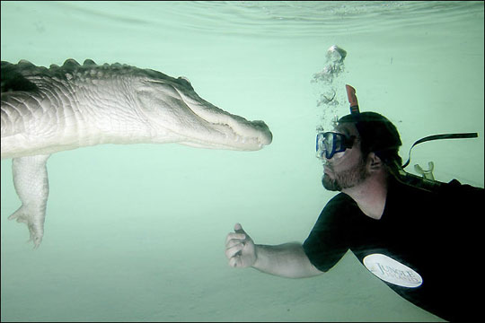 男子與鱷魚共舞。2009年1月17日,在美國佛州叢林島動物主題公園,男子Sean Manning與一條9英尺長的美洲鱷在水下上演“人鱷共舞”場面。Sean Manning沒有采取任何保護(hù)措施,在水下依靠通氣管進(jìn)行呼吸,表演各種高難度動作,為觀眾上演水下人鱷大戰(zhàn)驚險場面。