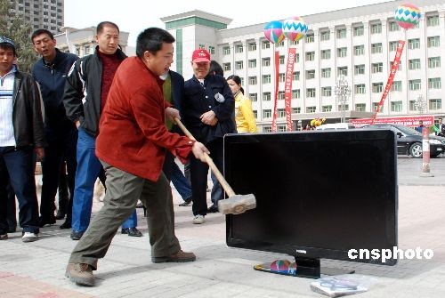 3月22日中午,在新疆庫(kù)爾勒市的中心廣場(chǎng)上,一名市民揚(yáng)起榔頭對(duì)著一臺(tái)嶄新的47英寸飛利浦液晶彩電砸去,這臺(tái)電視瞬間變得七零八落。當(dāng)事人稱,這臺(tái)電視剛買一個(gè)多月就出現(xiàn)故障,一直得不到售后服務(wù),出此下策。中新社發(fā) 汪濤 攝