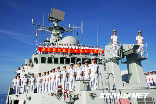 “廣州”號(hào)導(dǎo)彈驅(qū)逐艦跨越祖國傳統(tǒng)海疆線,回到祖國懷抱,艦上全體官兵在南海舉行回歸祖國儀式。