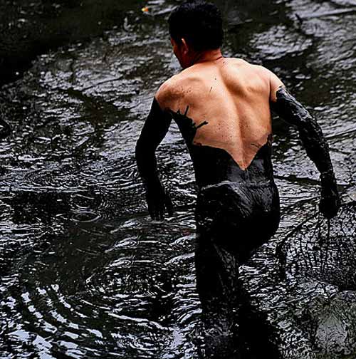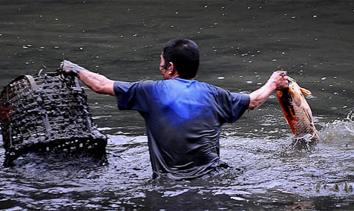 據(jù)華農某施工隊的鄭師傅說,學校為了迎接校慶,計劃縮小池塘面積,并重新規(guī)劃周邊區(qū)域。約一周前就開始不分晝夜抽水,至昨日滿塘水被抽到塘底。昨日中午就開始有人下水捉魚,大頭魚、鯉魚、鯰魚……品種很多,每條最少五六斤,幾個小時內已撈起近千斤魚。昨日下午3時許,曾有校衛(wèi)過來驅趕捕魚者。但校衛(wèi)一走,眾人又一窩蜂下水,之后再無人來干涉。