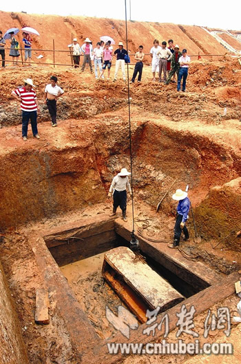 江夏區(qū)博物館館長劉治云告訴記者,經過連續(xù)的清理發(fā)掘,7日上午終于打開存放尸體的內棺。記者見到,內棺里全部充滿黃泥,考古人員小心翼翼用竹片一點點刮出淤泥,里面摻雜著不少黑色的渣滓和絮狀物,只是發(fā)現(xiàn)一塊玉石樣的物體,是墓主的下頜骨還是隨葬品有待考證。