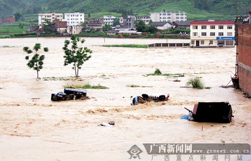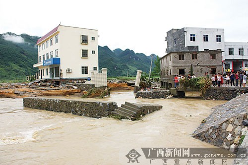 6月9日凌晨3時(shí)許,與貴州交界的環(huán)江毛南族自治縣馴樂苗族鄉(xiāng)遭受嚴(yán)重洪澇災(zāi)害,洪水淹沒大片田地,卷走多輛停放在馴樂街的汽車,馴樂河大橋坍塌,一名老年男子隨著被洪水卷走的房屋而失蹤。