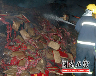 起火車輛是一輛半掛貨車,車上裝載物品正在燃燒并已經發(fā)生爆炸,濃煙沖天,燃燒物四散飛濺。在場民警立刻設置警戒線,疏散圍觀群眾。距離現(xiàn)場一公里左右就可以看到事故地點濃煙滾滾,火光沖天,周圍500米內到處是燃燒爆炸后的鞭炮殼。路上汽車已經排成長龍,雙向車道全部封閉確保過往車輛及司乘人員的安全。株洲消防、路政部門積極救援,現(xiàn)場消防部門四輛消防車同時作業(yè),前2輛消防車停在距起火車輛近20米處實施滅火,第三輛車鋪設二條水帶干線出二支水槍滅火,第四輛車負責供水,阻止鞭炮繼續(xù)燃燒爆炸。