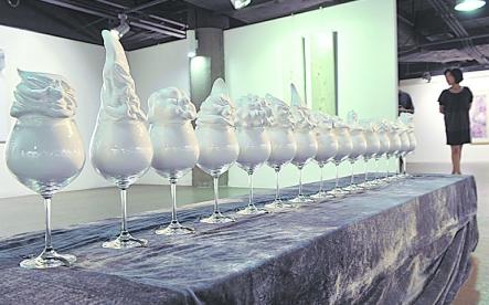 25日下午,記者在水碾河藍(lán)色空間畫(huà)廊內(nèi),在剛剛布展完畢即將在26日下午正式開(kāi)展的“新生———西南地區(qū)美術(shù)院校在校生選拔展中美巡展”中國(guó)站展覽的展廳里,一組15個(gè)遠(yuǎn)遠(yuǎn)看去完全就是冰淇淋一般的雕塑作品立即吸引了記者的注意。這組名為《石膏達(dá)斯》的雕塑,全部是用高腳紅酒杯盛裝的,雪白的“冰淇淋”從杯底一直延伸到杯口,并形成各式各樣的宛如冰淇淋塔尖的形狀,但走近仔細(xì)觀看,卻發(fā)現(xiàn)這些冰淇淋塔尖其實(shí)都是一個(gè)個(gè)物體的變形,有汽車(chē),有肯德基老人,有狗……25日記者通過(guò)電話(huà)聯(lián)系到了身在北京的參展藝術(shù)家、這些“冰淇淋”的作者張華,他表示,這些作品的靈感正是來(lái)自于冰淇淋,當(dāng)時(shí)他覺(jué)得冰淇淋塔尖的形狀變換很有意思,于是想到了把生活中常見(jiàn)的消費(fèi)場(chǎng)所、消費(fèi)標(biāo)志、人物、動(dòng)物融入冰淇淋式的雕塑中,我覺(jué)得“這既是一種好玩的雕塑,又是一種反映消費(fèi)社會(huì)現(xiàn)實(shí)的雕塑”。記者了解到,這些冰淇淋的雕塑售價(jià)令人咋舌:一組15個(gè),售價(jià)5萬(wàn)元,也就是說(shuō)每個(gè)售價(jià)約等于3333元!