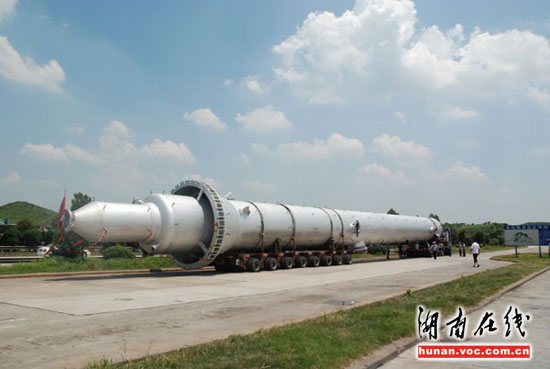 14日下午,一輛長(zhǎng)大貨車,馱著161.58噸重的巨型“導(dǎo)彈”途徑京珠高速潭耒路段時(shí),被耒陽(yáng)高速交警查獲。經(jīng)測(cè)量,該車總長(zhǎng)54米,其中所載“導(dǎo)彈”長(zhǎng)47米,相當(dāng)于三節(jié)火車車皮那么長(zhǎng)(單節(jié)火車車皮長(zhǎng)18米),屬嚴(yán)重超限,且駕駛員無(wú)法提供有效的超限通行證件。
