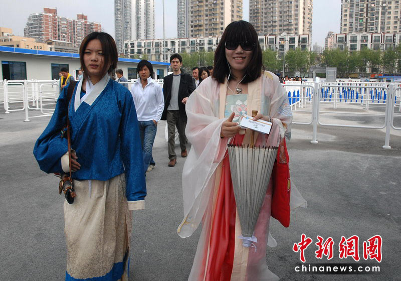5月1日,上海世博會正式開園迎客,首批游客入園參觀。來自浙江大學(xué)城市學(xué)院的大學(xué)生,特地穿上漢服觀看中國上海2010年世博會。徐和德 攝