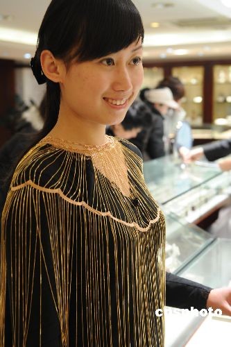 3月10日,在濟南泉城路一家金店,店員向顧客展示一款價值29.8萬元的金質披肩。據(jù)店方介紹,這款披肩在國內首度亮相,采用18k金機織而成,設計獨特,十足珍貴。中新社發(fā) 羅波 攝