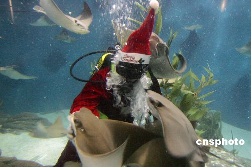 12月13日,上海海洋水族館上演“圣誕老人”海底喂食秀,由潛水員裝扮的圣誕老人在水下進(jìn)行喂食表演,吸引了眾多游人好奇的目光。中新社發(fā) 湯彥俊 攝