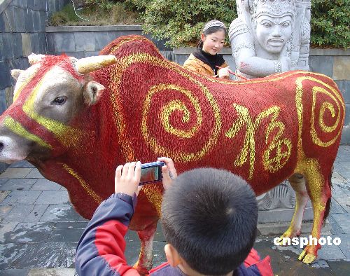 牛年春節(jié)將近,長沙世界之窗內愛玩的孩子們圍著一頭黃牛,為它涂上絢麗的色彩,形成創(chuàng)意十足的“!弊謭D案,用時尚的彩牛迎接即將到來的牛年春節(jié)。中新社發(fā) 肖前輝 攝