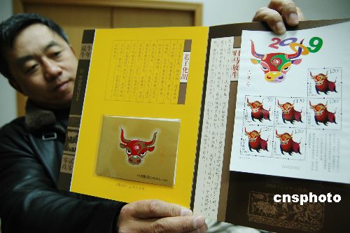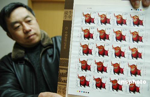 2009年1月4日,即將發(fā)行的《己丑年》特種郵票運(yùn)抵蘇州。據(jù)悉,國家郵政局和中國郵政集團(tuán)公司將于1月5日在蘇州首發(fā)該套以“奔!睘樾蜗蟮摹都撼竽辍诽胤N郵票。該次發(fā)行的《己丑年》郵票一套一枚,面值1.2元。郵票圖案為健壯倔強(qiáng)的奔牛形象,表現(xiàn)出奮力向前的視覺效果,寓意人們對生肖牛年的期望與寄托。中新社發(fā) 朱子寒 攝