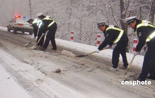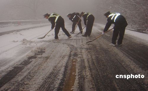 2009年1月4日,安徽省巢湖市含山縣交警大隊(duì)太湖山中隊(duì)的干警正在太湖山險(xiǎn)要路段鏟雪。元月3日夜間,該縣迎來(lái)今冬第一場(chǎng)雪,部分路段已積上厚厚的冰層。為了給即將來(lái)臨的春運(yùn)工作打下堅(jiān)實(shí)的基礎(chǔ),維護(hù)良好的道路交通秩序,給廣大群眾營(yíng)造良好的交通環(huán)境,當(dāng)天一大早,含山縣交警大隊(duì)太湖山中隊(duì)組織民警上路巡邏,重點(diǎn)加強(qiáng)對(duì)山路的安全隱患排查清理。中隊(duì)民警鏟除幾個(gè)連速?gòu)澋郎系暮駥颖,并用掃帚將鏟除堆積的冰雪清掃出路邊,保證了過(guò)往車(chē)輛的安全通行。中新社發(fā) 豐成 攝