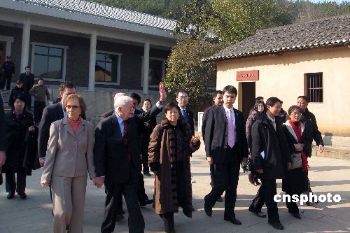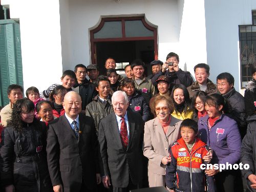 一月十四日,美國前總統(tǒng)吉米·卡特夫婦一行七人抵達武漢,并赴前中國國家主席李先念的故鄉(xiāng)湖北紅安縣參觀訪問。中國對外友協(xié)副會長李小林、湖北省副省長田承忠等陪同參訪。中新社發(fā) 艾啟平 攝