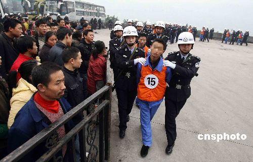 1月16日,重慶市公安局將30名扒手分別押至該市渝中區(qū)朝天門、菜園壩長(zhǎng)途汽車站、渝北區(qū)龍頭寺汽車站等主城區(qū)4個(gè)人口密集地區(qū),請(qǐng)市民辨認(rèn)和舉報(bào)。該市公安局方面稱,這些扒手幾乎都是慣扒,且全部是最近在他們作案時(shí)抓到的。之所以押到車站鬧市,是希望曾經(jīng)失竊的市民現(xiàn)場(chǎng)辨認(rèn)和舉報(bào),同時(shí)也是警方對(duì)扒手作案現(xiàn)場(chǎng)的恢復(fù)、重建等系列案?jìng)晒ぷ魇侄。中新社發(fā) 吳子敬 攝