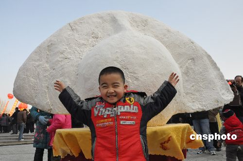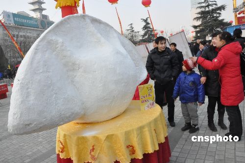 1月18日是農(nóng)歷新春小年,鄭州市“2009歡樂(lè)購(gòu)物過(guò)大年”活動(dòng)在綠城廣場(chǎng)舉行,1.8米長(zhǎng)國(guó)內(nèi)最大的實(shí)物餃子亮相鄭州市綠城廣場(chǎng)。中新社發(fā) 劉書(shū)亭 攝