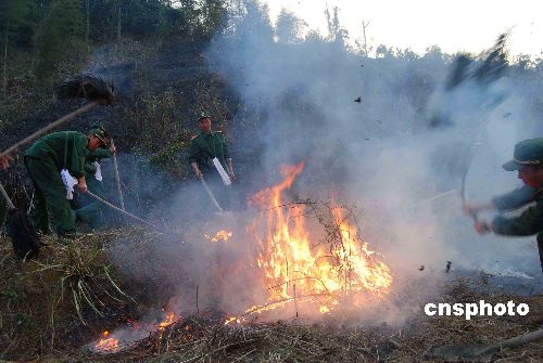 1月20日,武警福建總隊三明支隊官兵在奮力撲火。當(dāng)日下午16時左右,福建三明市梅列區(qū)洋溪鄉(xiāng)羊口仔村后山由于村民野外用火不慎引起山林大火。駐在附近的武警三明支隊100多官兵經(jīng)過1個多小時的奮力撲救,終將山火撲滅。中新社發(fā) 盧立杰 攝