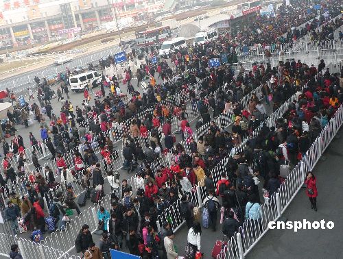 2009年1月21日,北京西站人頭攢動、旅客如織。據(jù)北京西站方面透露,根據(jù)車次的售票情況看,21日單日上車客流將超過23萬人次,達(dá)到本次春運(yùn)節(jié)前的峰值。中新社發(fā) 玉龍 攝