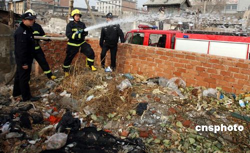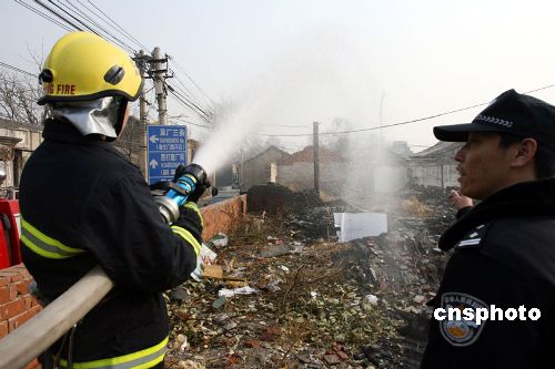 連日,北京遇大風(fēng)降溫天氣。為確保春節(jié)期間燃放煙花爆竹等消防安全,近日,北京崇文警方會同消防部門清理市民居住區(qū)內(nèi)各樓道及房前屋后的可燃物,拆除在消防通道上搭建的違章建筑,并派出消防車專門對前門地區(qū)重點部位、火災(zāi)隱患較為嚴重的院落實行人工降雨,確保春節(jié)期間消防安全。中新社發(fā) 胡建強 攝