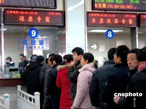 2009年1月23日,鐵路南京站售票大廳的退票窗口前排起長隊。據(jù)了解,這種狀況已持續(xù)一段時間;疖嚻币黄彪y求的狀況下尤為引人注目,據(jù)稱多為多渠道重復(fù)購票所致。中新社發(fā) 王路憲 攝
