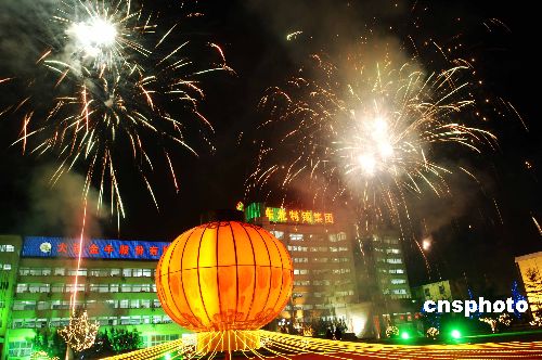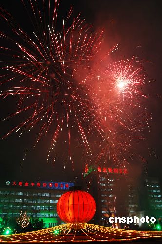 1月25日除夕夜,東北特鋼集團(tuán)大連基地廣場五彩繽紛禮花綻放空中,迎接牛年到來。當(dāng)晚,大連市大街小巷爆竹聲聲,人們?cè)诮k爛的煙花中迎來2009農(nóng)歷新年。中新社發(fā) 劉德斌 攝