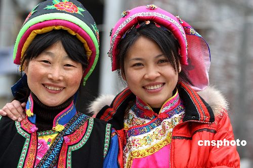 1月26日農(nóng)歷牛年第一天,5·12地震重災區(qū)四川省北川縣擂鼓鎮(zhèn)羌族女中學英語教師謝紅霞(左)穿上民族節(jié)日盛裝到各個羌族村寨看望她的學生和家長。去年地震發(fā)生時,謝紅霞與全體教師沉著鎮(zhèn)靜地將所有學生保護到安全地帶,學生與家長們由衷地感謝這些教師。中新社發(fā) 任晨鳴 攝