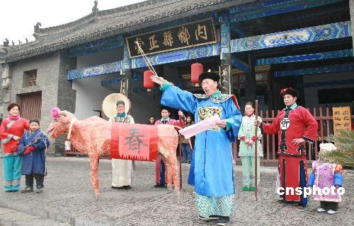 2月4日是立春節(jié)氣,在河南內鄉(xiāng)縣衙,身著清代服裝的工作人員,在表演“打春!惫(jié)目。中新社發(fā) 張中立 攝