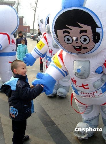 2月4日,《飛天壯歌——中國(guó)首次太空漫步航天展》新聞發(fā)布會(huì)現(xiàn)場(chǎng),河北兒童與扮成“航天員”的工作人員握手!讹w天壯歌——中國(guó)首次太空漫步航天展》全國(guó)巡展即將于2月13日在河北省石家莊市啟動(dòng)。主辦方稱,這是中國(guó)航天史上規(guī)模最大、規(guī)格最高的航天尖端科技成就展,將有大量神七航天實(shí)物現(xiàn)場(chǎng)展出,包括神七宇宙飛船返回艙、價(jià)值三千萬元人民幣的宇航員艙外航天服、火箭整流罩殘骸,以及翟志剛遨游太空出艙時(shí)揮舞的國(guó)旗等重要實(shí)物。中新社發(fā) 牛琳 攝