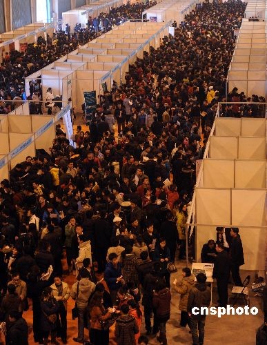 2009年2月6日,2009山東半島城市群春季人才交流暨黃河三角洲開發(fā)人才招聘大會在山東濰坊舉行,吸引數(shù)萬應(yīng)聘者到場。中新社發(fā) 王志德 攝