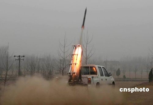中國許多地方正在遭受嚴(yán)重干旱,各地抓住氣象條件動(dòng)用人工增雨等辦法以緩解旱情。二月七日下午,安徽省出現(xiàn)有利增雨作業(yè)的天氣過程,十六時(shí)許作業(yè)飛機(jī)在蚌埠機(jī)場穿云破霧實(shí)施今年首次飛機(jī)增雨作業(yè)。八日八時(shí)、十時(shí)、十四時(shí),人工增雨作業(yè)飛機(jī)又連續(xù)三次先后在阜陽、六安、淮北、亳州、淮南、宿州、蚌埠等皖北地區(qū)作業(yè)。同時(shí),安徽旱區(qū)六市十四個(gè)縣和兩個(gè)區(qū)開展了次地面人工增雨作業(yè)。據(jù)統(tǒng)計(jì),七日下午至八日十六時(shí),安徽省已經(jīng)在干旱嚴(yán)重的皖北地區(qū)實(shí)施四駕次飛機(jī)人工增雨作業(yè),一百多次高炮火箭作業(yè),增雨面積達(dá)十萬平方公里,旱區(qū)普降三毫米以上甘霖,最大降雨量八點(diǎn)五毫米。圖為火箭人工增雨作業(yè)現(xiàn)場。中新社發(fā) 王兵 攝